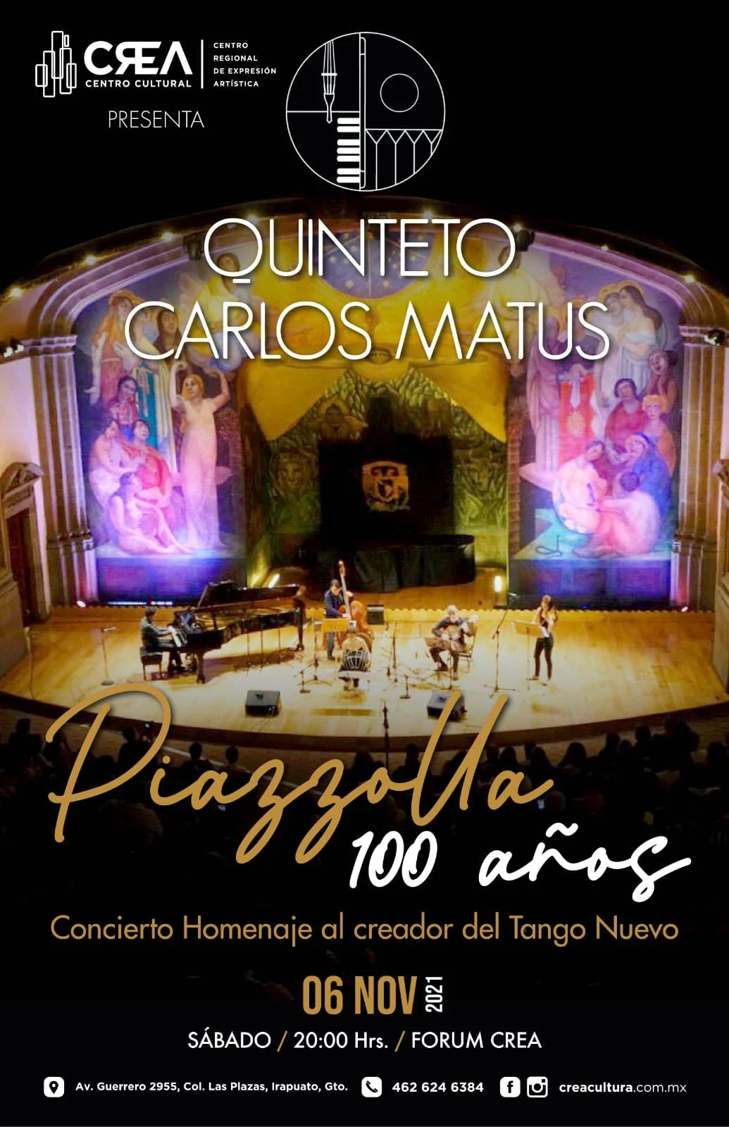 Quinteto Carlos Gómez Matus: Piazzola 100 años, concierto homenaje al creador del tango 1 nov Escrito por Valerie Campos Fuente: creacultura.com.mxConsulta la información Valerie Campos